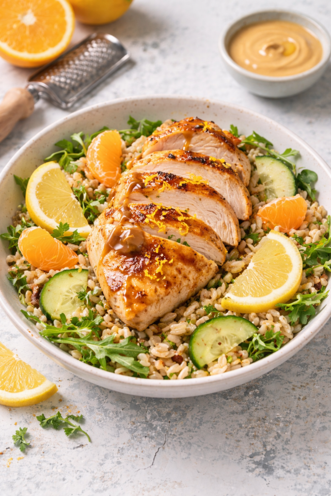 Bright, juicy, and slightly sweet—this bowl tastes like sunshine after a long day. The citrus-garlic chicken stays tender, the farro adds chew, and the honey tahini ties everything together with creamy, nutty bliss. Great warm or cold, and perfect for busy lunches too.